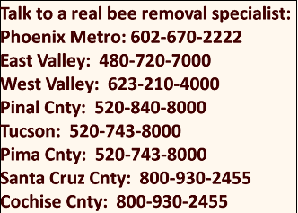 A real Arizona bee removal specialist is a experienced beekeeper who practices beekeeping, is licensed by the State of Arizona in pest control and is highly trained and experienced in AZ bee removal, both in honey bee removal and African killer bee control, honeycomb removal, bee swarm removal, wasp removal, wasp nest removal and wasp control.